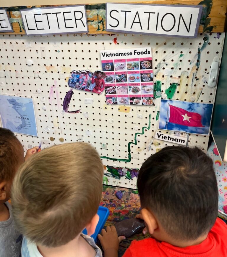 The Intermediates class at Merryhill Research Park in Champaign, Illinois spent AAPI Heritage Month learning all about Vietnam. One of our Vietnamese families was kind enough to bring in a Vietnamese hat and Che Chuoi, which is a warm Vietnamese pudding-like dessert for our students to try. The students learned that different countries have different flags, and created their own Vietnamese flags, identified Vietnam on a map, and looked at images depicting the culture.
